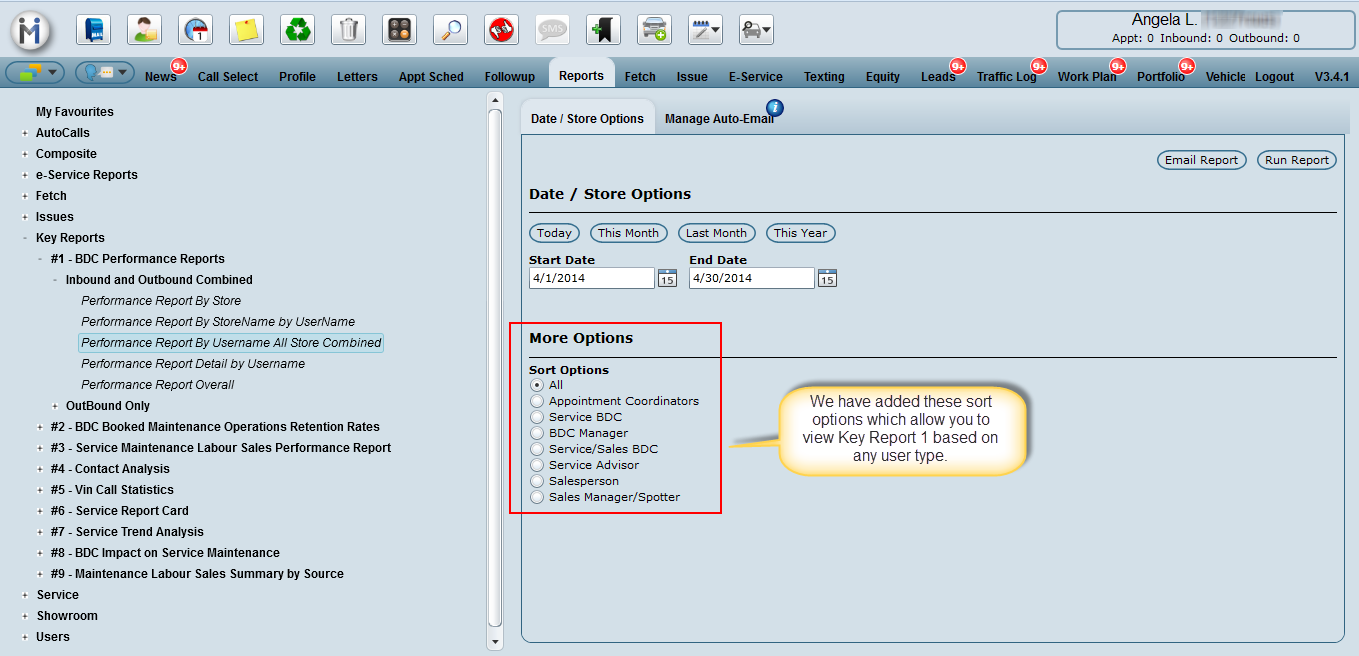 We have added sort options to all Performance Reports, with the exception of the detail report. The sort options allow you to run this report based on a specific user type, which allows you to hone in on the users you want to see without having to sift through all users. I.e. Choosing "Appointment Coordinators" will bring back all Service BDC, BDC Managers or Service/Sales BDC only without showing any other users. The default selection is "All".