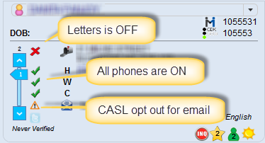 Mailing Address, Home Phone, Work Phone, Cell Phone, Email Address - Green check indicates these contact methods are ON, red X indicates the contact methods are OFF.
