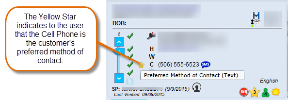 When a user selects the customer's preferred method of contact in Contact Methods, DealerMine will display a Yellow Star beside the preferred method in the Customer Info section of the Profile screen.To set the Preferred Method of Contact go to Editing Customer Information > Contact Methods. When the user hovers over the Yellow Star a tool tip will display "Preferred Method of Contact". If no Yellow Star displays this will indicate no preference has yet been specified.