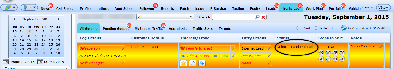 When Add Up is turned on in Email Setup>I-leads and a user is deleting a Showroom Lead it will also delete the corresponding Traffic log entry. After deleting the Traffic Log entry will display the Status as "Delete - Lead Deleted" on the "All Guests" and "Deleted Guests" Traffic filter on the Traffic Log tab. This will also work the same when deleting a Traffic Log entry, will also delete the corresponding Showroom Lead, and display the same Status "Delete - Lead Deleted" on the "All Guests" and "Deleted Guests" on the Traffic filter.