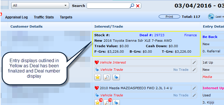 When a Deal has been finalized it will display on the Traffic Log outlined in Yellow with the Deal information and the Deal Number displaying in Blue, this will help the deal's stand out from other worksheets where payments have been presented.