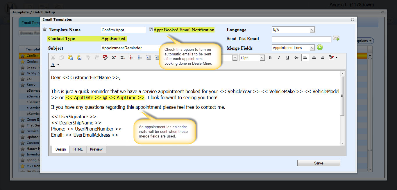 The ApptBooked email templates allow you to create a template that will be sent out to customers with email after every service appointment booking done in DealerMine.Â