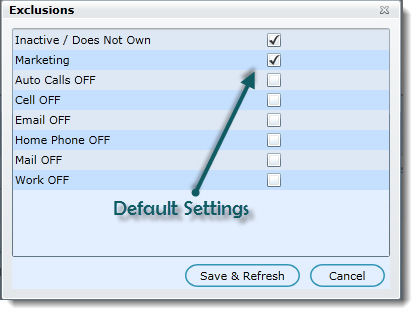 Exclusions is an advanced option which will allow you to include or exclude customers or VINS that have been turned off for various reasons in DealerMine. By default all Inactive customers are excluded from any Fetch campaign, as well as all VINS that have been turned off as Does Not Own.  Â