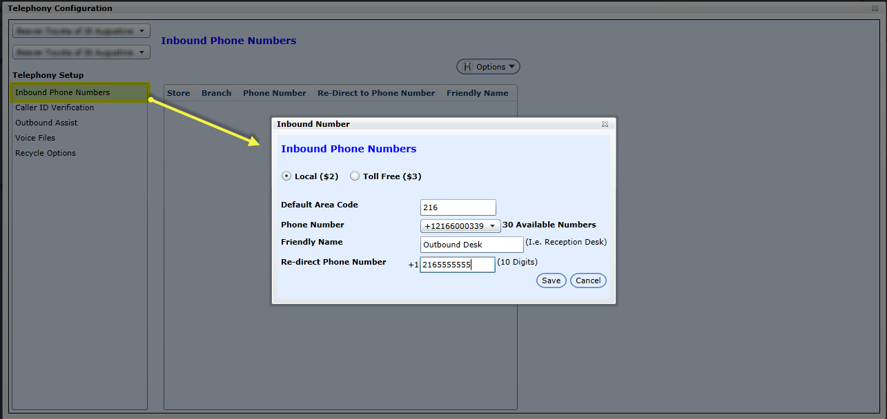 Dealerships can buy inbound numbers either local ($2 month) or toll free ($3 month)