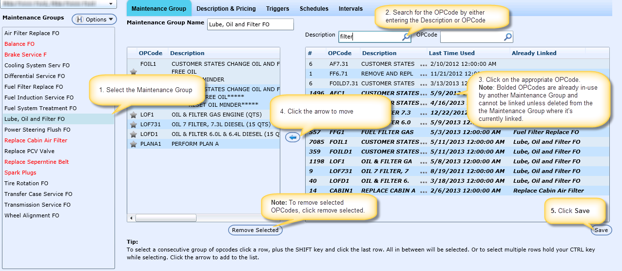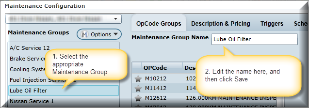 Note: If a Maintenance Group is in Red, it indicates that the Maintenance Group doesn't have linked OPCodes or has no Descriptions and Pricing entered.