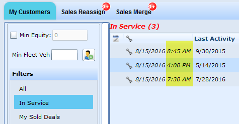 When viewing Portfolio >My Customers > In Service DealerMine will display the time of the appointment after the date. This will make it easier for a Sales Person to know the exact time a customer is coming in for Service.