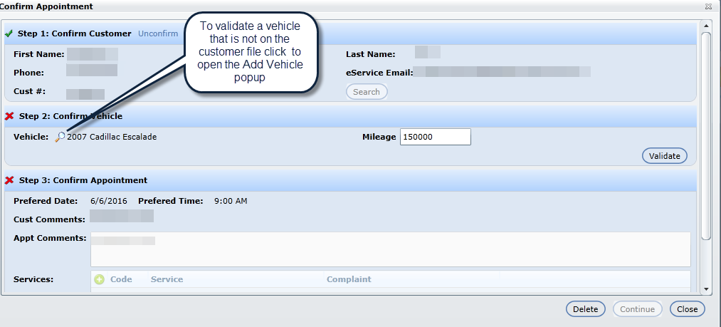 Appointments that are not pushed directly to the DMS, or appointments that require some type of validation before being pushed to the DMS are displayed in the the Unconfirmed tab. Also customers that have been validated and draft appointments have been saved will remain in this tab until the draft appointment is successfully pushed to the DMS.