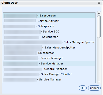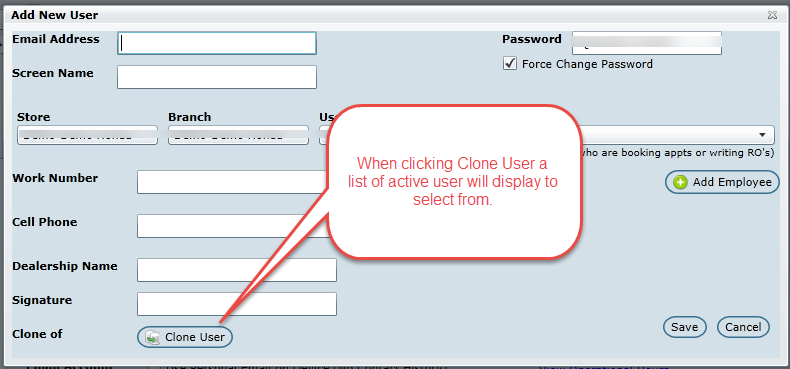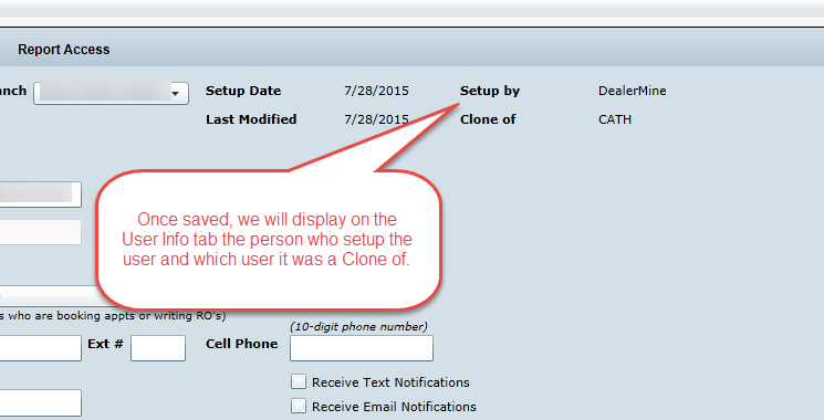 After saving you will be taken back to the User Info tab where DealerMine will display Setup by and Clone of for future referencing purposes.  Â