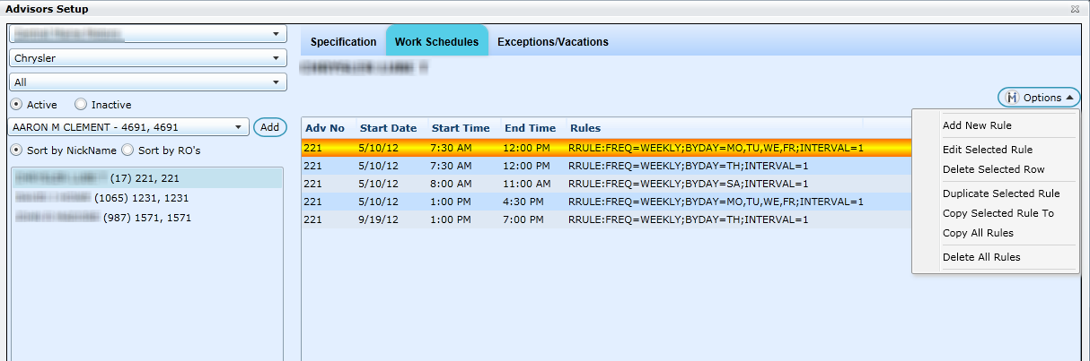 To make changes to the Work Schedule, select the Advisor's name in the Advisor list box, highlight any row and click the Options drop down. (See screenshot below)