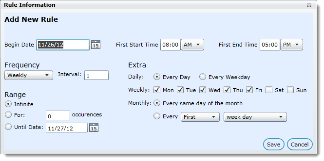 Note: The functions under the section Extra are not required, but can help to refine the schedule. Enter other specifications under this section; i.e. select whether a schedule happens for Every Day of that week or Every Weekday; select the Weekly days that the schedule occurs; set the schedule Monthly to Every same day of the month, or select Every First, Second, Third, etc week day, weekend day, Monday, etc.
