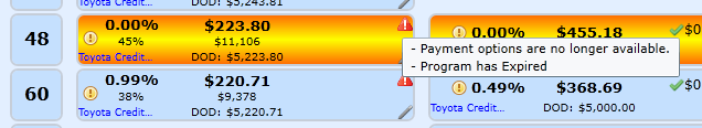 For Finance/Lease option the Flag will only display in the payment option if one or more expired incentives was/is selected in the Incentive popup, or the Payment option is not available or has changed since the saved date.