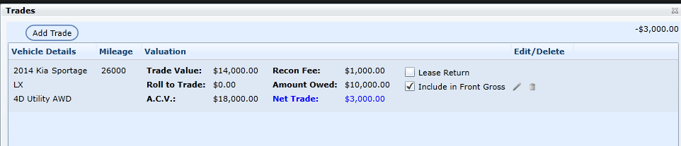 If you choose to include the Trade in the Front Gross it will have a direct impact on the Front Gross. We use the A.C.V - (Trade Value + Roll to Trade) to determine the impact it will have. This basically shows what the Front Gross is if the vehicle sells for that amount once included in used inventory. Click the Front Gross to view the breakdown and from this screen you can adjust the A.C.V of the Trade in the MSRP column.