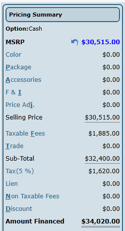 The selling price is the sum of all lines above it. MSRP + Color + Package + Accessories + F & I - Price Adjustments = Selling Price. You can also edit the Selling Price quickly and easily. When edited we will automatically add a price adjustment for the difference between the new selling price and the MSRP. Click the blue arrow anytime to revert back to original selling price.