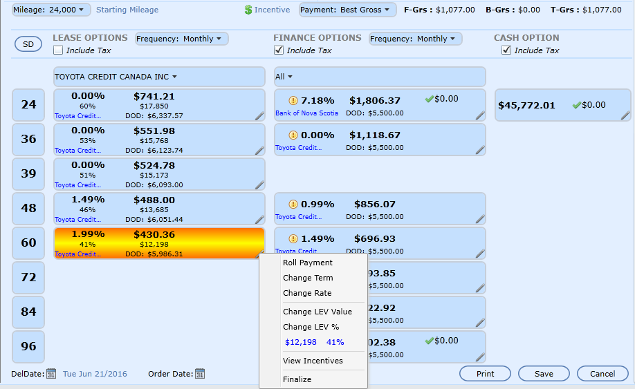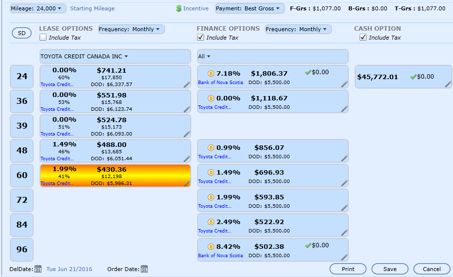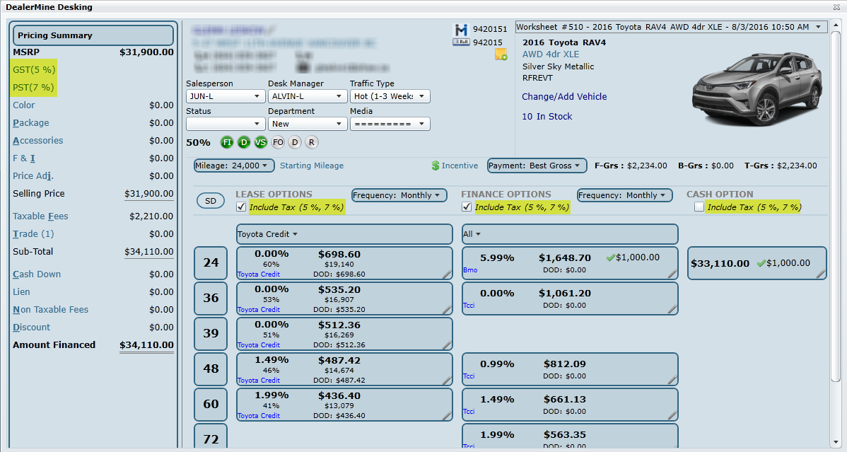 Our one-click Desking screen opens automatically, displaying 15 + payment options instantly. Incentives can be automatically applied for lease, finance and cash or must be applied manually. From left to right the screen will layout the pricing summary, customer info etc., as explained in more detail below.