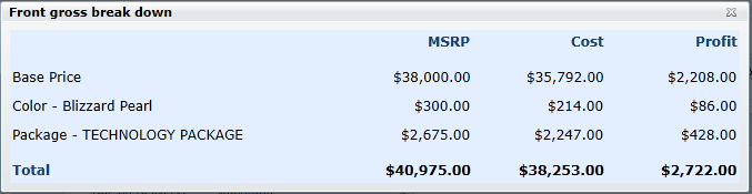 Click the F-Grs to display a breakdown screen. This popup will give a break down of the Front Gross, the user will also be able to edit the MSRP and the Cost columns, when a change has been made the Profit column will update automatically. When closed the new values entered will display on the Desking screen.