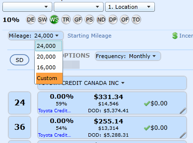 Use the Mileage Allowance drop down to choose a mileage allowance or enter a custom one for leasing. All mileage options available will display. Payments will refresh automatically when selected.