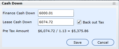 This popup will also clearly indicate the Cash Down tax calculation and the user can select to Back out Tax by checking the "Back Out Tax" check box, which will only affect the Lease payments.