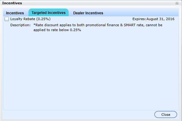 The incentive link allows you to view all incentives available, rather than having to do it on each payment. The popup will display three tabs as follows: Incentives, Targeted Incentives and Dealer Incentives. When selecting or unselecting an Incentive it will reflect on the payments displayed in the payment matrix. The Expiry Date will also be displayed in the Incentives screen, next to each incentive.