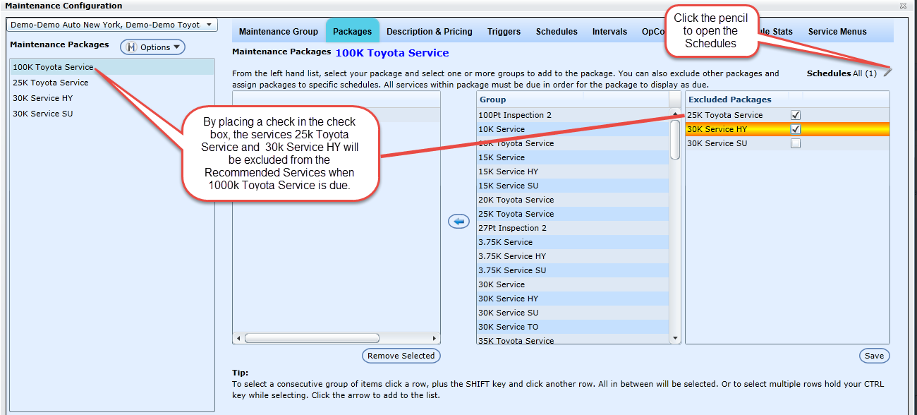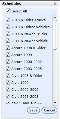 From this screen a user can also Associate a Maintenance Package with a Schedule. After selecting the Maintenance Package and the user would click on the Pencil beside Schedules which will display all the schedules for that Store/Branch. The user would then choose the Schedules that they want to associate with the selected Maintenance Package, when that Maintenance package comes due it will only show for the selected schedules. (i.e. When selecting 1000k Toyota Service in the Maintenance Package section and then select the Schedule "2010 & Older Trucks" the service 1000k Toyota Service will only show as recommended on "2010 & Older Trucks").