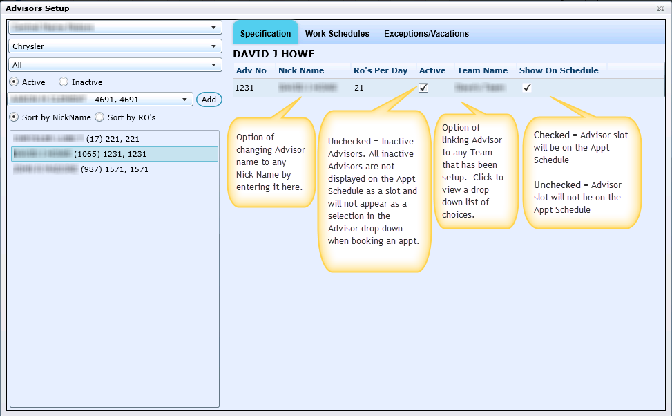 Active - uncheck to make an Adivsor inactive (do this to terminate an Advisor who no longer works for the dealership). After 30 days of inactivity, Adiviors automatically become unchecked.