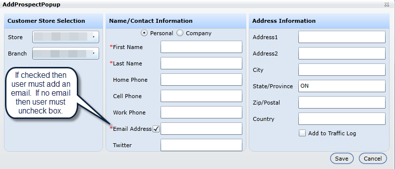 When creating a Prospect file the user now has the option to add or not add an email address. If the Email Address check box is checked then the user must enter in an Email address for the Prospect before saving, if unchecked then this is optional and the Email address is not required before saving.