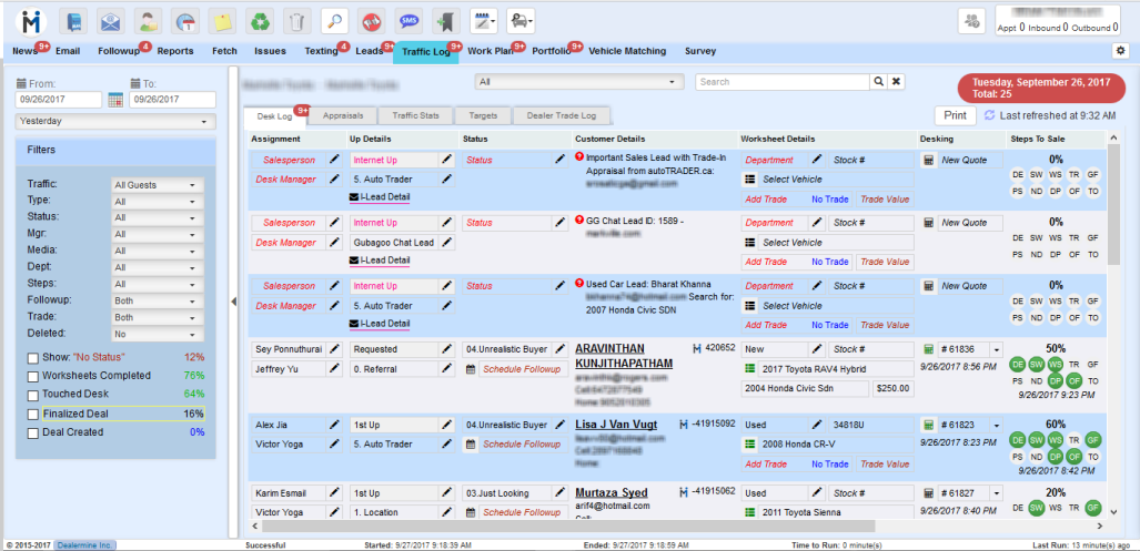 The Traffic Log contains all traffic (Up's added) to the log each day. The Desk Log is the default sub-tab when viewing the Traffic Log and is the entry point for Desking deals.