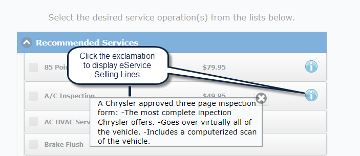 eService Selling Lines - in Maintenance Configuration - Description & Pricing the Admin User with access can add Selling lines to Maintenance Groups which will provide the customer with additional information for the selected service. When a customer is booking an appointment through eService, all services with selling lines will display an information icon they can click or touch to read the selling lines.