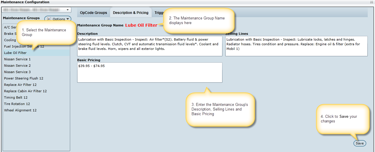 Description and Pricing appears when hovering over or selecting a Maintenance on the Profile Screen (as seen in the image above). To populate those boxes, select the Description and Pricing tab and key in the information in the appropriate boxes: