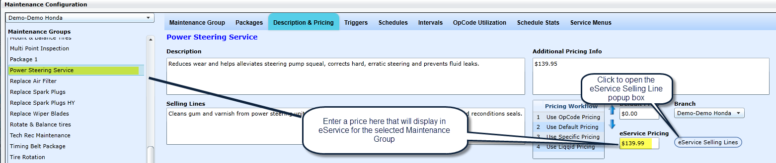 In Maintenance Configuration > Description & Pricing for eService per Store/Branch, Admin Users can edit the eService selling lines if eService Pricing is set to display in eService Configuration.