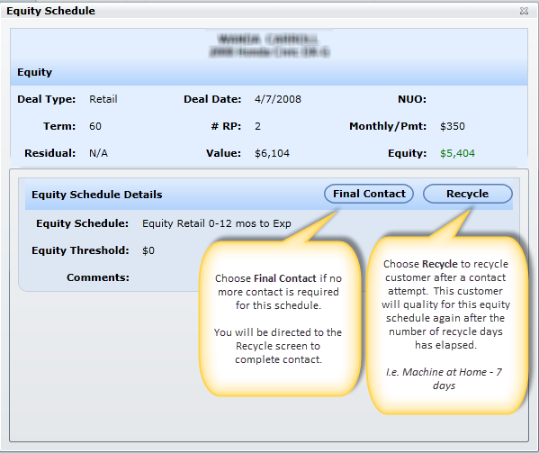 Click Final Contact to remove this customer from any future contact for this particular equity schedule, while recycling and entering notes. I.e. Final Contact: Contacted Customer - 7 days - Customer isn't interested in purchasing another vehicle at this time. They prefer to be payment free for as long as possible. Â