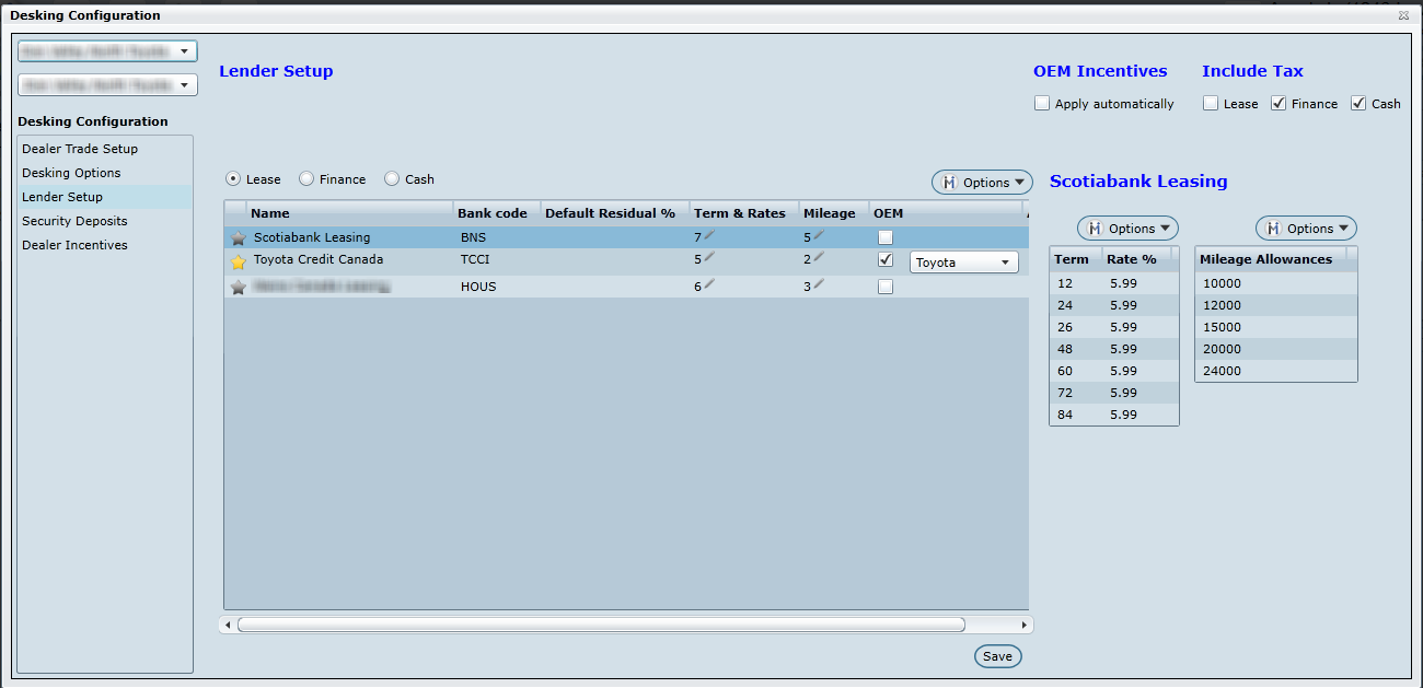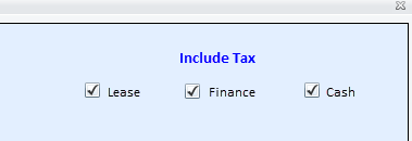 A "Include Tax" option will display in the top right of the Lender Setup screen, with a check box for Lease, Finance and Cash. When one or all of these are checked the tax will automatically be included for that option Lease, Finance or Cash when looking at the Payment options and Price of the vehicle when in the Desking screen.