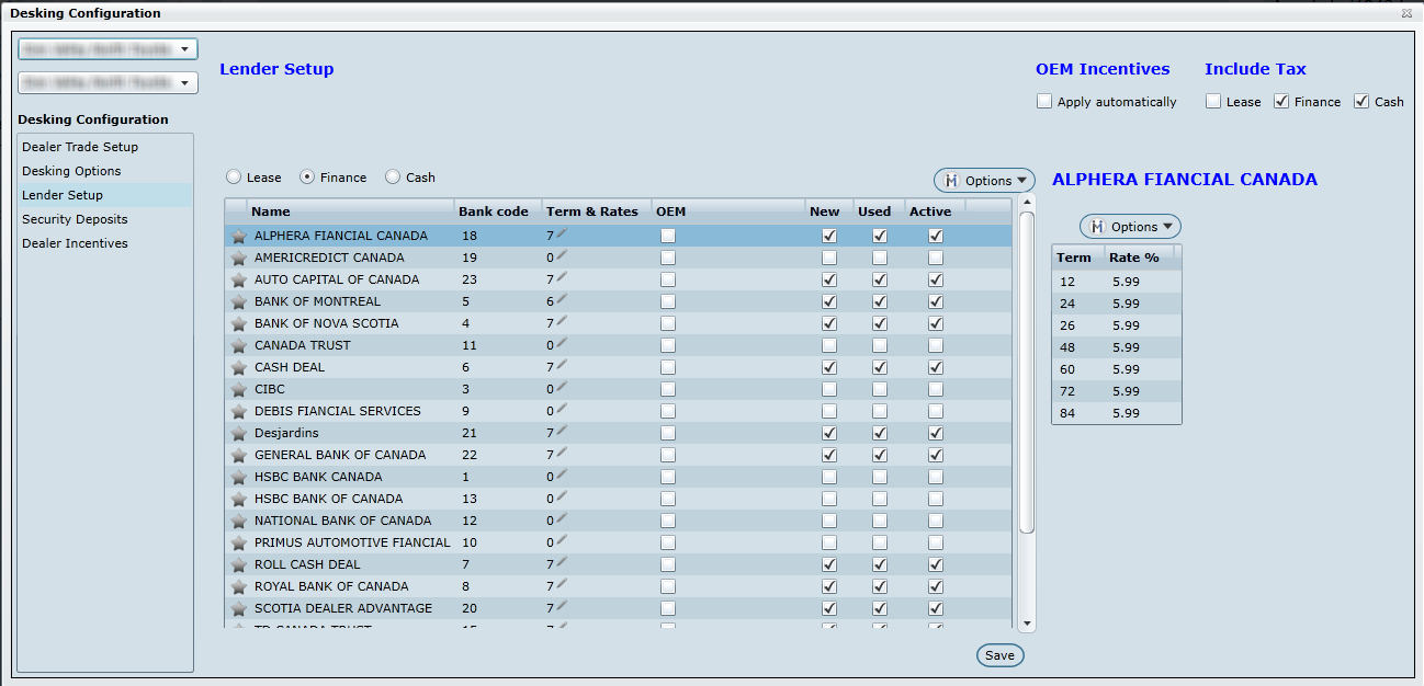 In Showroom Config > Lender Setup we have add a New and Used option to Finance. From here the user can select what Lenders will be active in the Lender drop downs on the Desking screen for New and for Used. The Admin can select New or Used or both from the Finance grid or when adding a new Lender in the Add Lender popup.