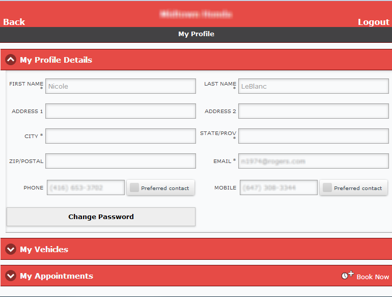 This section allows you to customize contact information, select preferred method of contact for phone number, and change password if needed. Any changes to customer information will be pushed directly to DealerMine and the DMS if integrated.