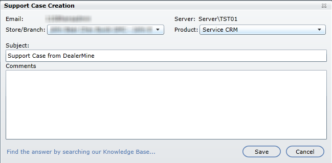 Send an email quickly and easily to our Business Support team and a case will be automatically created for you. By sending through DealerMine we will send your user info, server info, store/branch, web browser and pull in any comments you enter along with the product you choose from the drop down list.