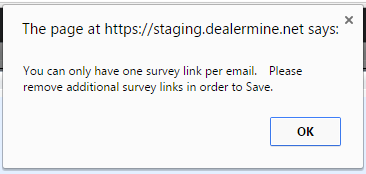 When adding a Survey link to an Email Template, DealerMine will limit the amount of Surveys to one per email. If a user attempts to add more than one survey they will be presented with a pop up message to remove any additional surveys.Â