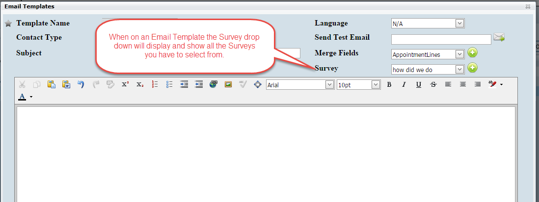 In order for surveys to be sent they need to be included on an email template in the same manner as a merge field. The Survey drop down list will appear under the Merge Fields drop down if Surveys exist for the corresponding Contact Type. When clicking on the drop down we will display the Surveys that have been saved for that Contact Type. Place your cursor where you'd like the Survey link to appear and select your survey and click the green plus button. The Survey name will appear as a hyperlink to the customer when receiving the email. Once the email is sent out, the customer will be able to click on the link and fill out the Survey.