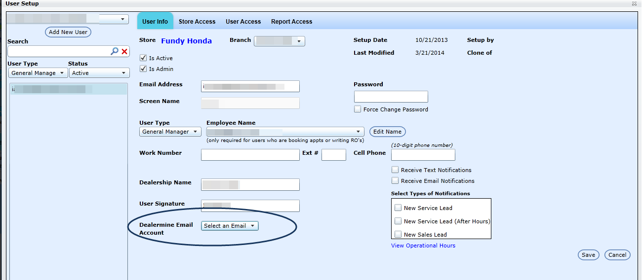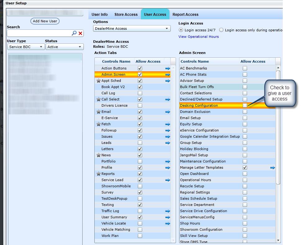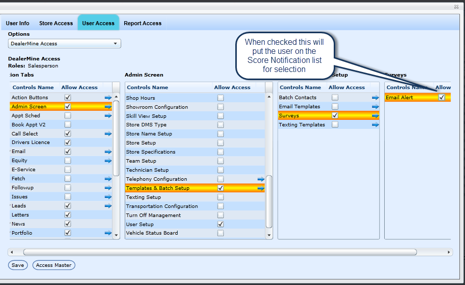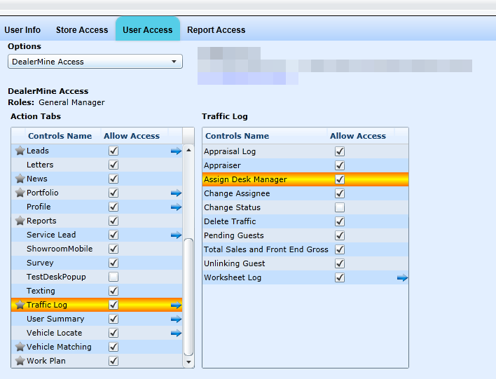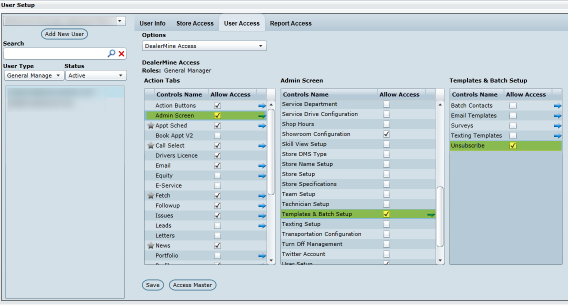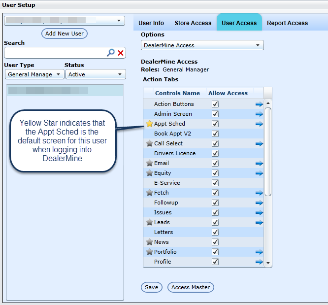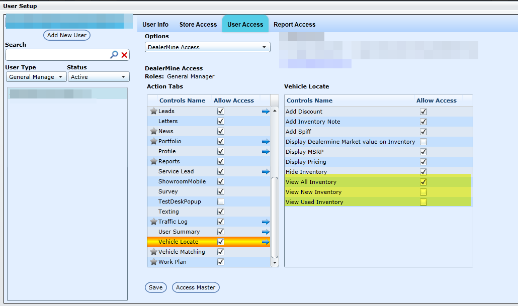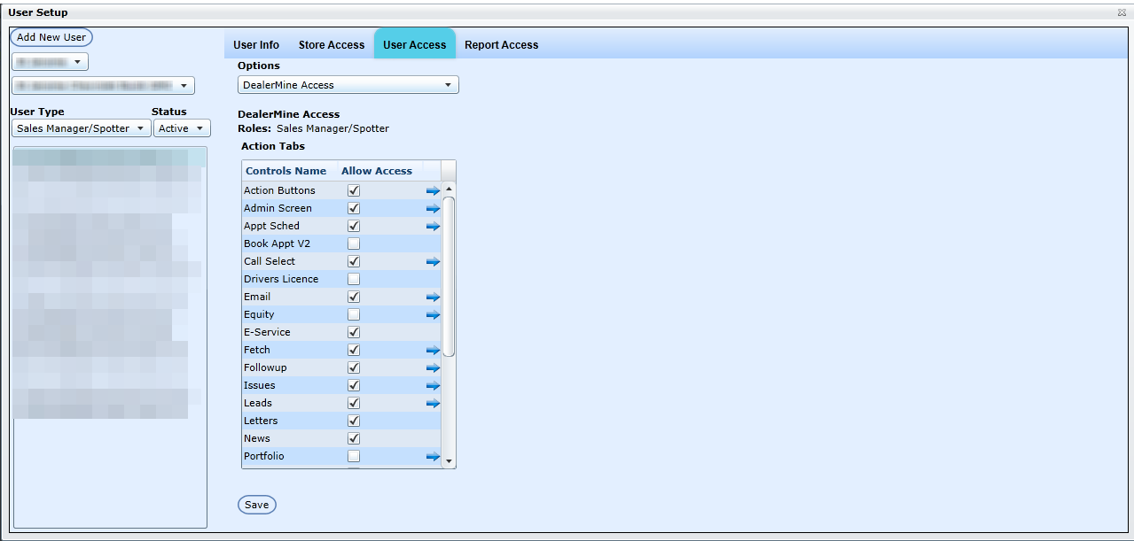 User Access will allow you to customize each user's own settings in DealerMine. We have basic settings per role (user type) which will automatically be set when each user is created. User Access allows an Admin user to modify any user's settings if required.  Â