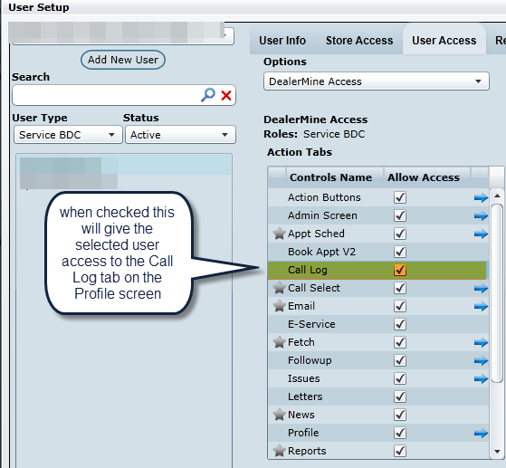 A user can be grated access to the Call Log tab by placing a check in the Call Log check box in User Setup > User Access > "Call Log", once this change is saved the user will now have access to view the Call Log tab.