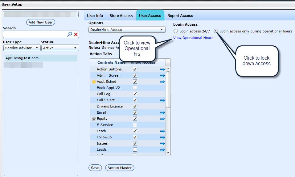 Now a Dealership has the option to lock down User access based on Operational hours. In User Setup > User Access > DealerMine Access there is a new radio button "Login access only during operational hours", when this radio button is selected for a user, that user will only be able to log into DealerMine during the hours set in Operational Hours.