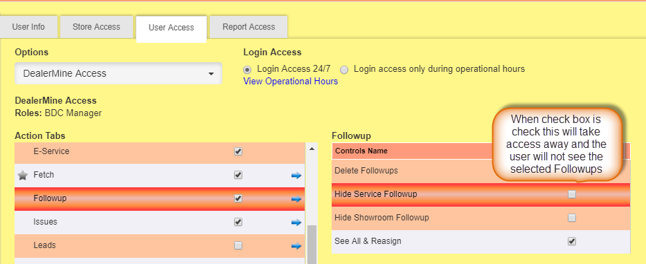 To take access away so a user cannot see either Service or Showroom Followups simply go to User Setup - User Access - Followups and then either check Hide Service Followup, Hide Showroom Followup or both. By default this options will be on so neither option will be checked.