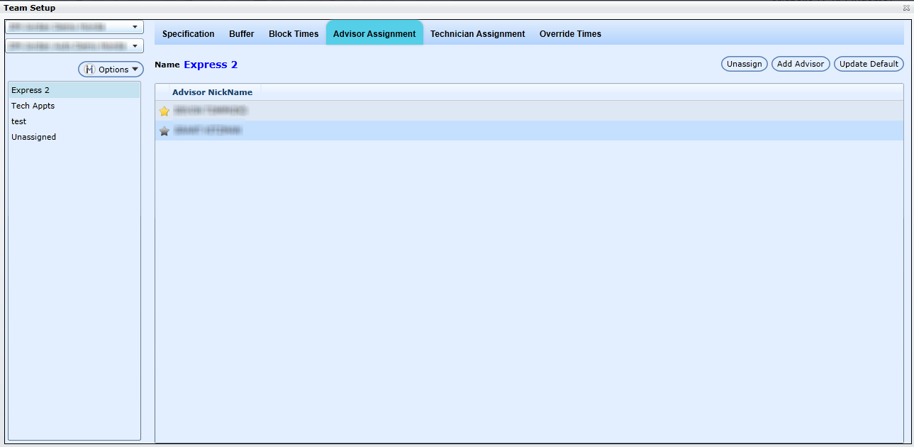 Note: Ensure the team that is assigned to an advisor is also assigned to that team in the Advisor Setup screens. You also have to have at least the "Unassigned" team attached to an advisor for overflow functionality and blocked times to display properly.Â