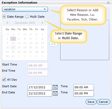 Exceptions/Vacations will allow you to block off any Date Range or Multi-Date (s) for any Technician when they are out of work. (Vacation, Sick etc.)