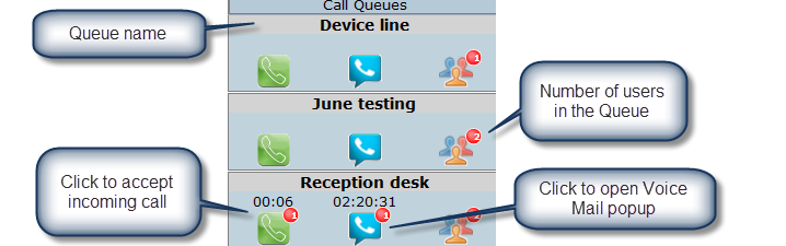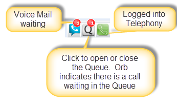 Queues (Show/Hide) - allows the user to click and hide the queues. When there are calls waiting to be answered an Orb will display with a number count to let the user know how many calls are waiting. If no orb, then no calls waiting.