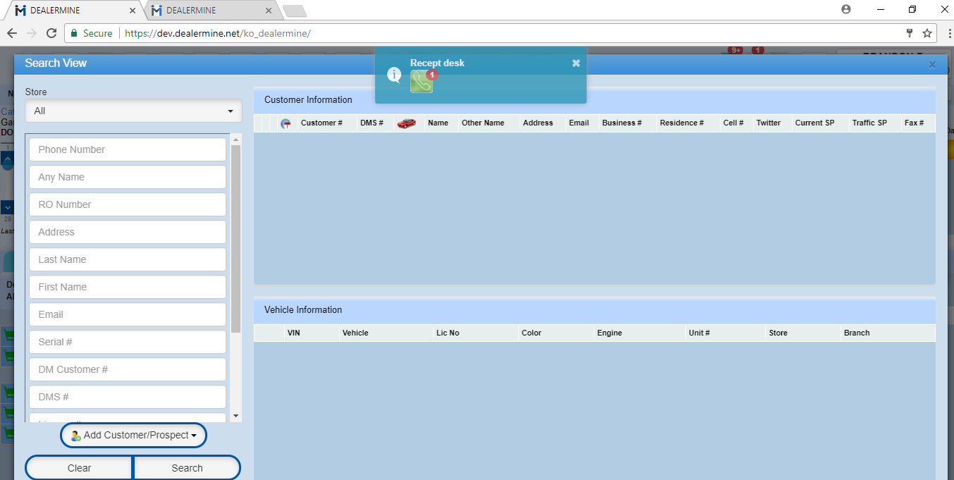 When there is an incoming call a pop up will display near the top center of the screen notifying the user, regardless of what screen may be in view in DealerMine. This notification must be closed by the user. This will help notify the user if they are in the middle of something such as booking an appt, searching an existing customer etc. The Call Queue window will also be in view. Once the user clicks to accept the call the Search screen will and the phone number will populated in the and any customer with that matching phone number will display on the grid. The user can then search out the correct customer and bring up the customer's file for that call.