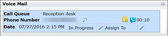 In Process - as soon as a user clicks the Voice Mail icon from the Call Queue the voice mail status will be In Process and will be assigned to that user