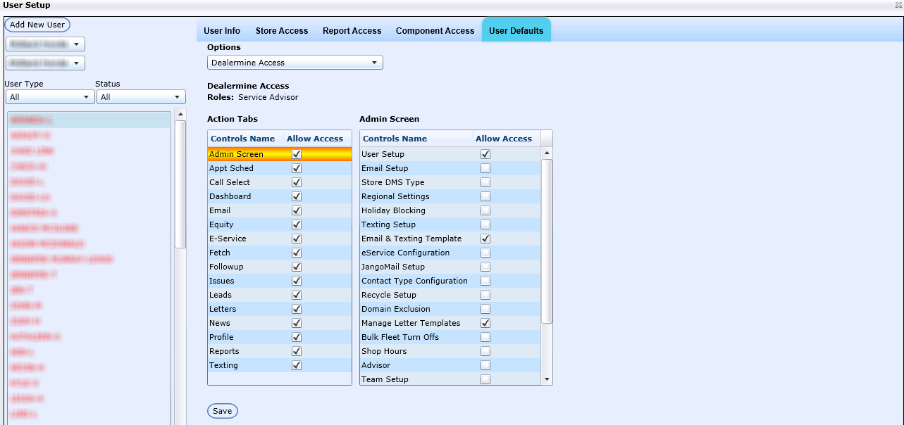 From the User Defaults tab, select the Options drop down and click Dealermine Access. Presented on the screen are the Action Tabs, and the default tabs are automatically selected that pertain to that role. If there are additional tabs that the user requires, click the check box next to the tab name. Once the tab is checked, if there are additional functions on the tab that require granting of access, those functions will appear in another menu with check boxes; for example, when action tab Admin Screen is checked, it presents another menu called Admin Screen which has additional controls that require granting of access (See Figure 1: Dealermine Access). Select the tabs and functions that the user needs and click Save.