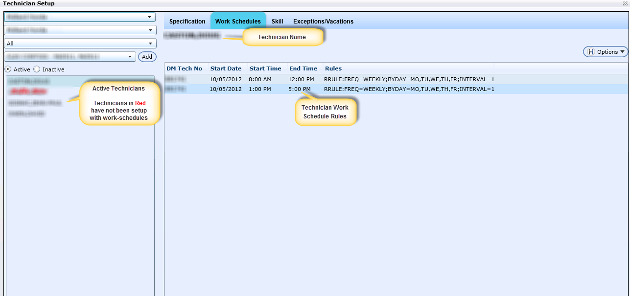 Any Technicians listed in RED have been recently pulled over, but not yet configured with a work schedule. Once you create a work schedule, or copy an existing work schedule to a Technician listed in RED, they will no longer appear in RED.
