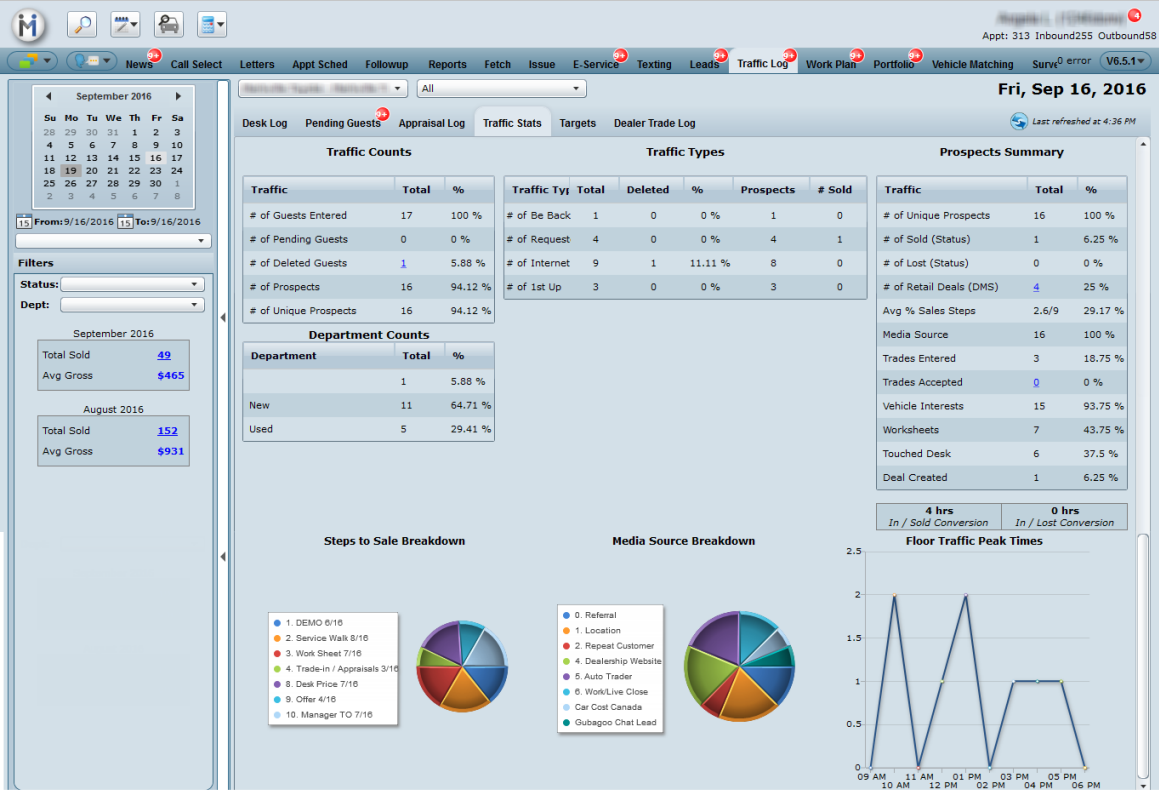 The Traffic Stats will summarize your Traffic Log based on any time frame. You will see at a glance how much Traffic is being entered, how many prospects are being created, what type of traffic is coming in and how many prospects are being lost and/or sold.