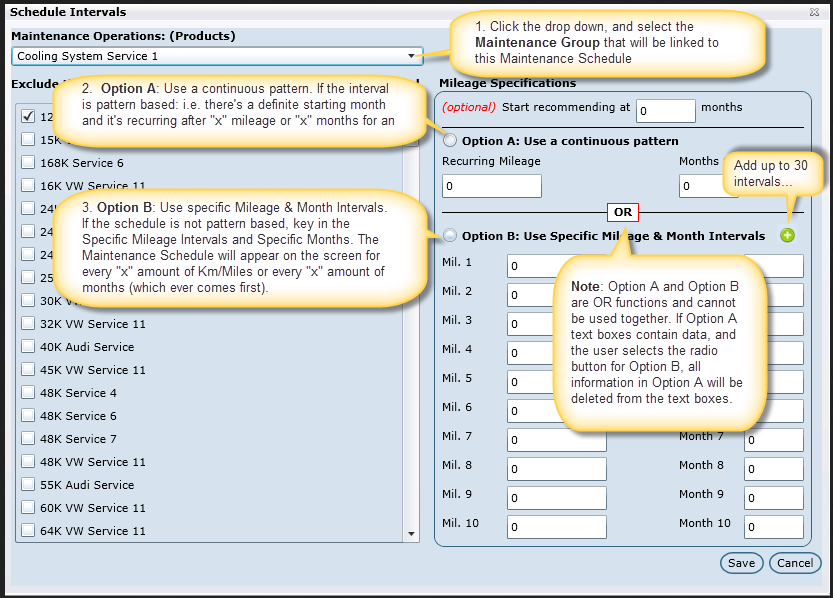Option B: Use specific Mileage & Month Intervals. If the schedule is not pattern based, key in the Specific Mileage Intervals and Specific Months. The Maintenance Schedule will appear on the screen for every "x" amount of Km/Miles or every "x" amount of months (which ever comes first).Â