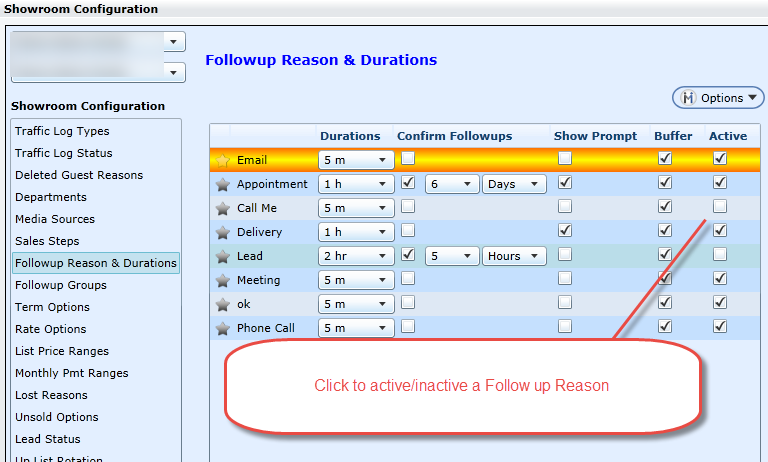 A user can choose which Followup Reasons will display in the Google Calendar Setup. In Showroom Configuration a use can acti